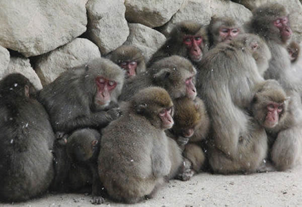 日本动物园数十只猴子抱团取暖抵御寒冬
