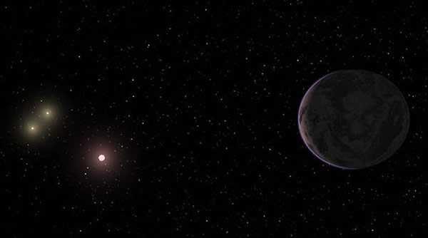 “这颗行星在一个三合星聚星系统里围绕其中一颗恒星运转。其他恒星都相当遥远。”