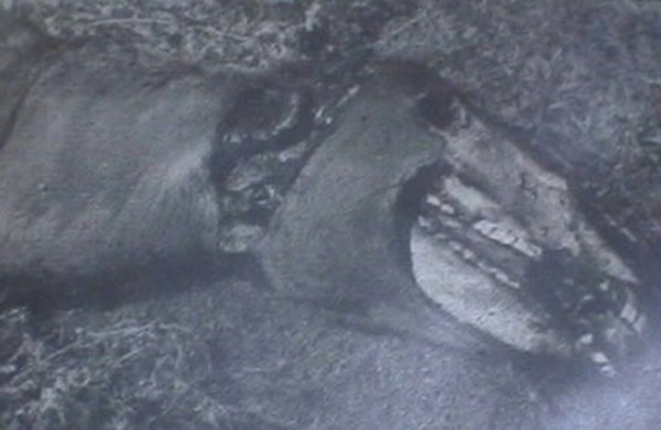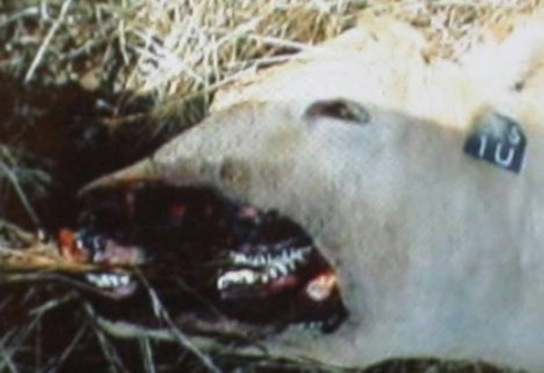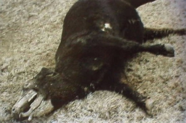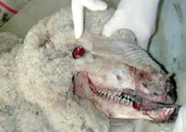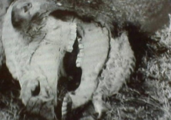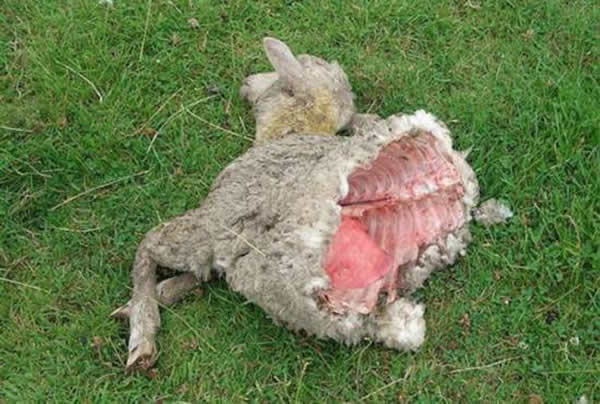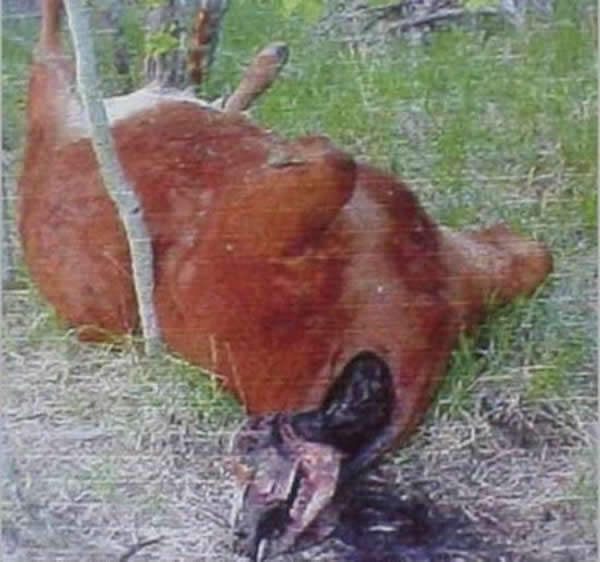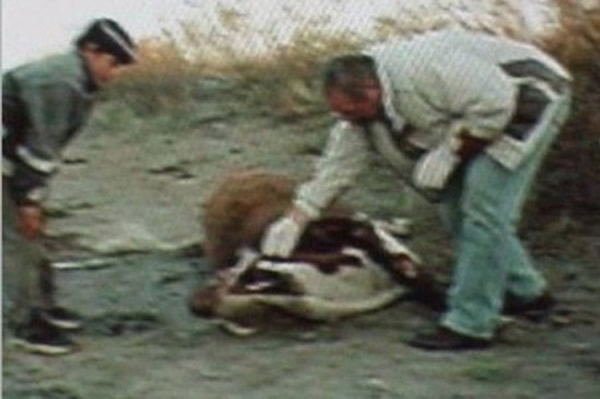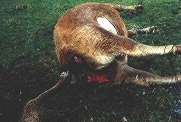 当时有一则警方的报告详细记录了令人毛骨悚然的疑似外星生物的恐怖活动。该报道中指出有许多奶牛从牧场建筑附近被不明飞行器扔下,牛的性器官被锋利和精密的仪器摘除、甚至连骨头也被剔除。图为被肢解并掏空内脏的羊,附近没有半边血迹。