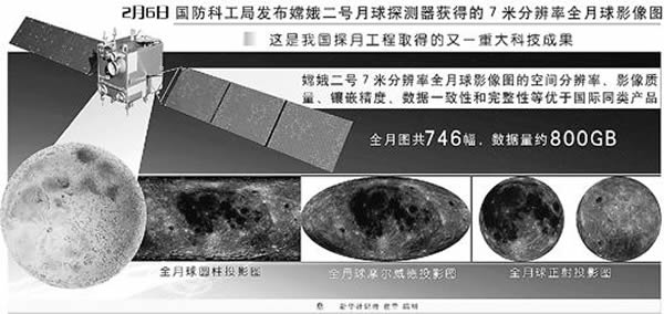 2月6日,国家国防科技工业局发布了探月工程嫦娥二号月球探测器获得的7米分辨率全月球影像图,这是目前国际上已公布的分辨率最高的全月球影像图。