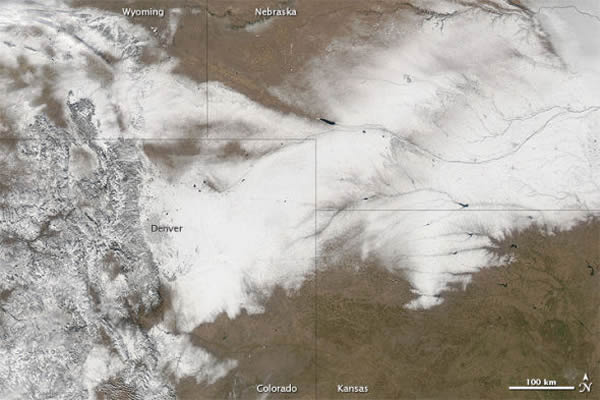 美国宇航局地球观测站(NASA Earth Observatory)今日公布了一张卫星照片,展示了美国科罗拉多州和内布拉斯加州的大雪景象。