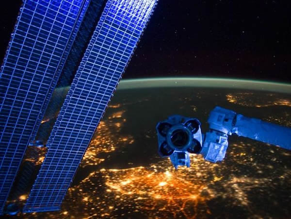 一幅刚刚公布的照片,由国际空间站上的宇航员拍摄,展示了美丽的欧洲夜景,空间站的太阳能电池板和一条机械臂的末端也在照片中出现。照片中底部的灯光最为明亮,所在地区为比利时和荷兰,不列颠群岛的灯光部分被左侧的太阳能电池板遮住。