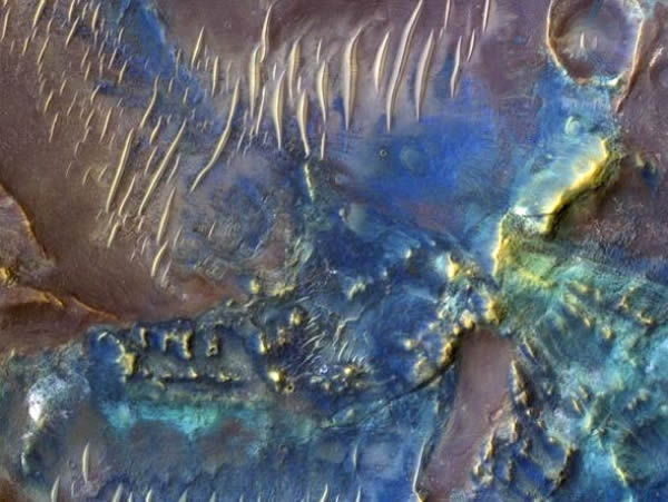 一幅新公布的照片,由美国宇航局火星侦察轨道器携带的超高分辨率成像科学实验照相机拍摄,展示了火星上色彩绚丽的托罗陨坑。这幅色彩增强照片突出了陨坑底部的矿物质多样性,蓝色和绿色代表辉石和橄榄石,暖色则代表粘土和其他矿物。长长的黄线为沙丘,年代不及周围的岩床。
