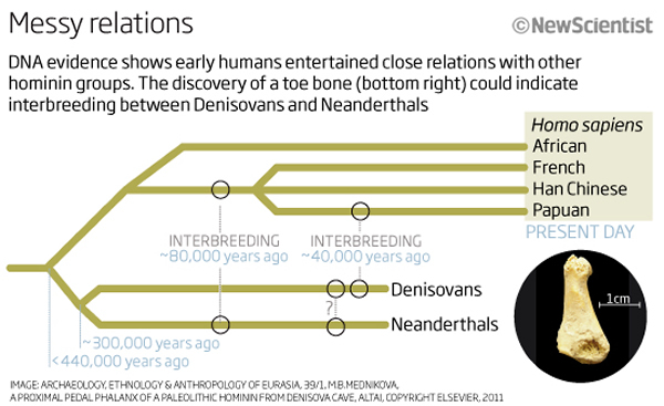 现代人和其他人群的亲缘关系,右下角为测序使用的丹尼索瓦人指骨