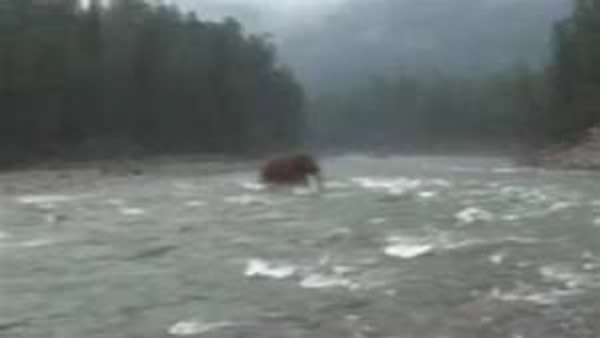 视频中,一头长着红棕色皮毛且有着两颗又细又长“象牙”的庞然大物正在淌水过河。从外形上看,它拥有着早已灭绝了的长毛象所有的特点。