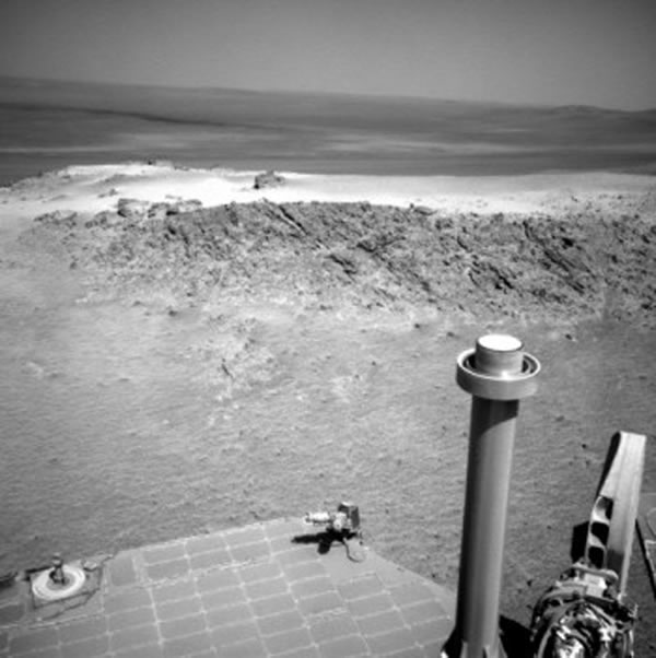 图中显示了机遇号火星车使用导航相机拍摄的火星表面图像,左上方的环形山将是机遇号度过第五个火星冬天的地方。这张照片由机遇号拍摄于2011年11月,并于2012年1月公布。