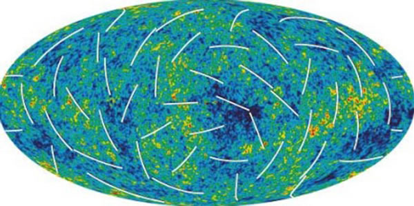 WMAP探测器绘制的最新婴儿宇宙图像,分别用红色和蓝色的进行标记,而白色的条纹显示了最古老的光线方向出现了“极化”。科学家通过这些信息可确定宇宙中第一代恒星的形成,并提供了揭开宇宙的大爆炸后瞬间所发生事件的新线索。