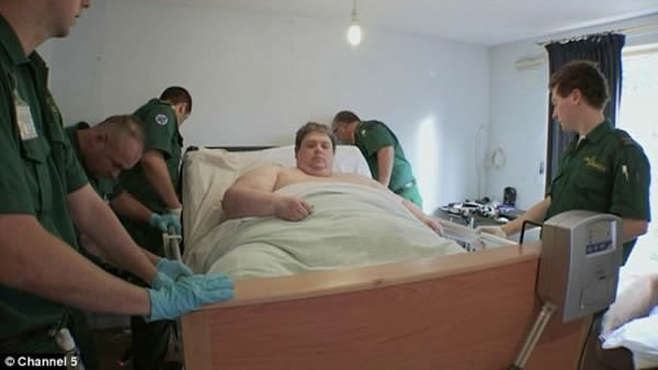 英国男子基思-马丁体重将近60石(381.02公斤),10年间一直无法离开他的住宅。要用8个人和一副超大担架才能移动他,而且这项工作只有专家组能够胜任。