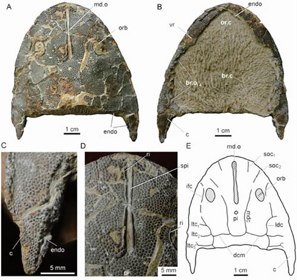 长孔盾鱼正型标本(IVPP V 17681),A 背视,B腹视,C、D为局部放大,E为背视线条图。(朱敏供图)