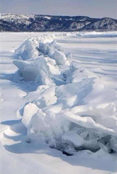 该“神仙过河”景观其实是由于结冻的湖面反复地热胀冷缩,使得冰块都出现像并排立起一样的隆起现象。不过,这样的现象只能在结冰但降雪较少的湖上看到。长野县的诹访湖以“神仙过河”景观闻名,但一般好几年只出现一次。而在屈斜路湖几乎每年都能看到这样的景观。