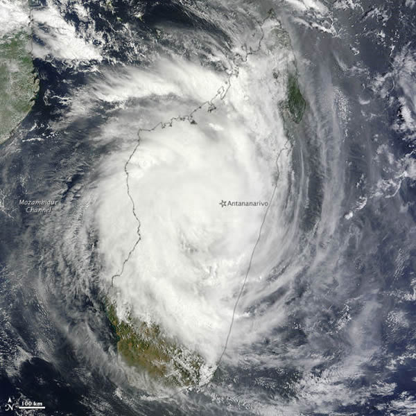 2012年02月14日,美国宇航局泰若卫星(Terra)上的中分辨率成像光谱仪(MODIS)拍下了这张自然色照片。风暴登陆之后,似乎不像前一天那样有组织性,但风暴云几乎完全遮蔽了马达加斯加岛。