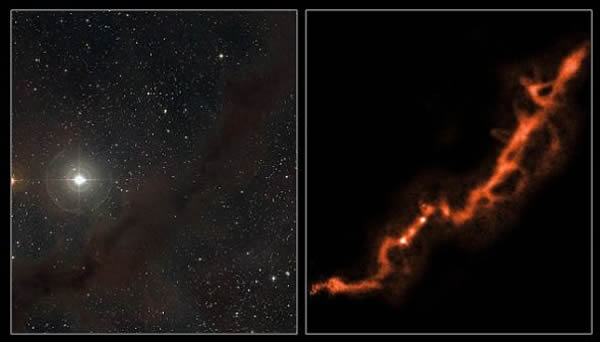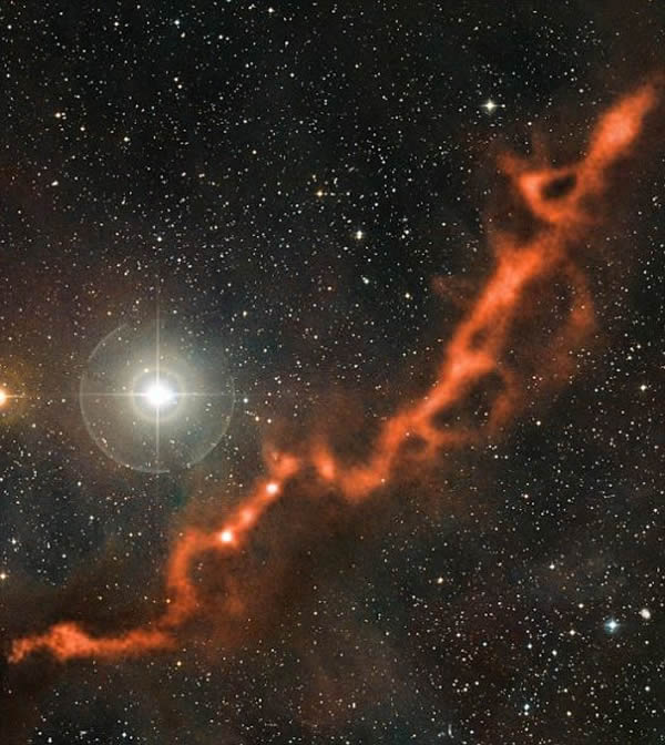 从可见光范围看,宇宙尘埃“丝状物”呈黑色。这台阿塔卡马望远镜利用“亚毫米”波长显示常规光学望远镜无法看到的发光云团