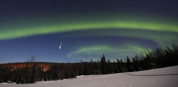 这是近期在美国阿拉斯加费尔班克斯拍摄的极光照片。在这一画面中还可以注意到有一道明亮的白光划过天空,这可能是一颗流星。