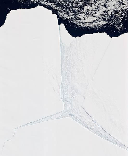 这是南极埃默里冰架上三道巨大的冰裂隙交会的场景,由美国宇航局地球观测-1号卫星获取。随着南极大陆冰盖的东部逐渐向海洋移动,埃默里冰架上开始逐渐出现冰裂隙。