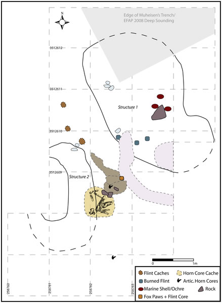 在木屋里,考古学家们发现了故意烧毁的羚羊角内核,赭红色颜料和从250公里外的地中海和红海冲刷来的贝壳珠。这表明当时人们与当地有着紧密的互动并进行远距离的物物交换。其他考古发现还包括刻有规律阴刻线的骨头,有几何雕刻图案的石灰石,甚至还有证明当时人类在此地区埋葬过世的人的证据。
