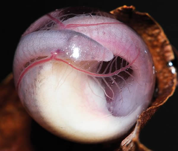 这是此次新发现的蚓螈物种“Chikila fulleri”的胚胎,图像是透过其透明的外壳使用显微镜拍摄的。在图像中透过透明的外壳还可以清晰地看到内部的卵白,这是用来供应胚胎发育所需营养物质,直到它们成长为幼年个体的。大多数蚓螈类生物在其幼年都会经历一段类似蝌蚪的水生游泳阶段。