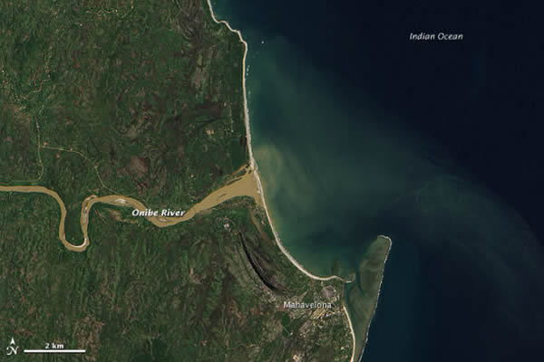 2012年2月19日,NASA地球观测卫星1号(EO-1号)上的先进陆地成像仪(ALI)拍下了这幅泥沙淤塞的乌尼贝河的自然色照片。整条河呈现一种泥泞的棕色,并正在向印度洋输送一股巨大浊流。