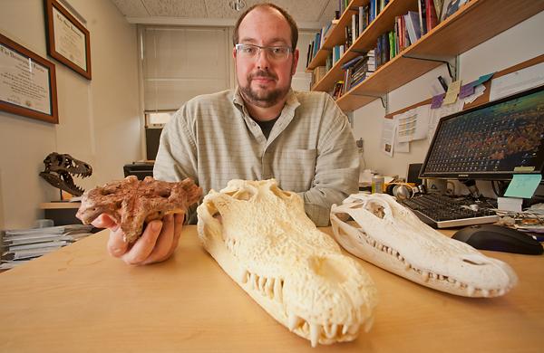 在非洲西北部的摩洛哥,美国研究人员曾经挖掘出一块奇特的古生物头骨化石。这块硕大的头骨化石令研究人员起初误以为它属于一种恐龙,因为这块化石所属的地层也正是恐龙时代,距今约9500万年前。然而,经过进一步的分析,研究人员确认它是一种远古鳄鱼。它们生活在远古海洋里,是一种咸水鳄。