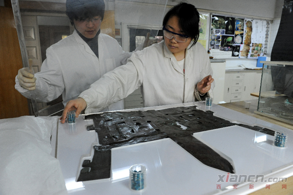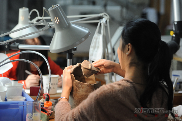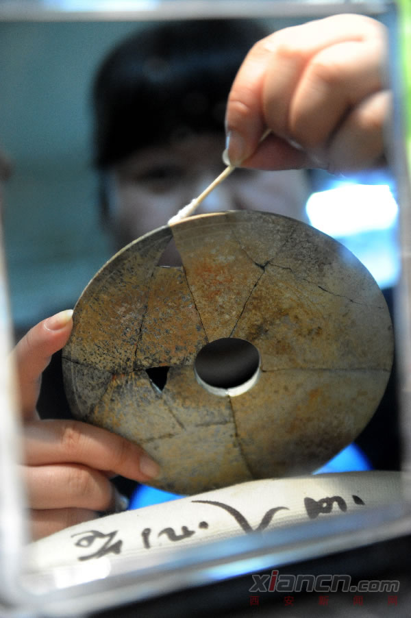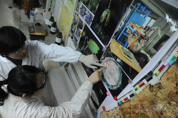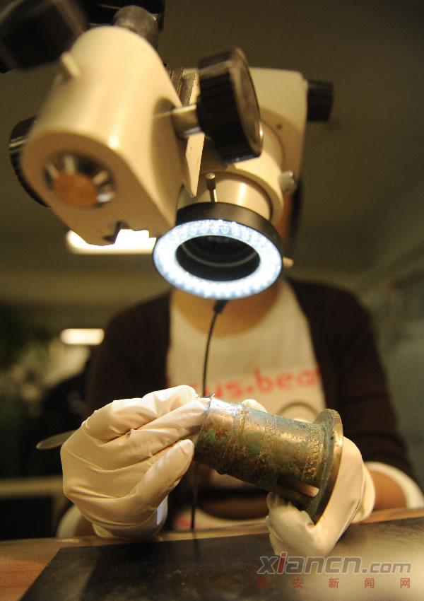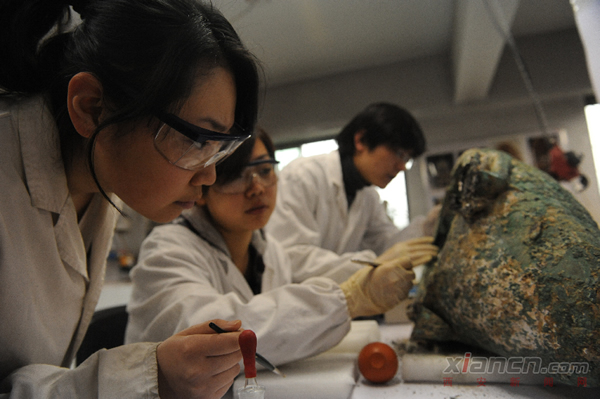 一位年轻女孩正用仪器“轻点”眼前泛着土色不规则椭圆金属物体,一阵“滋啦啦”的声音传来。原来是在用超声波一点点清除文物上的“硬锈”,这件不起眼的金属物体,竟是一只秦陵出土的青铜天鹅。“当时出土了一批姿态各异的青铜水禽,这只天鹅出土的时候,颈和身体断开了。现在除锈的是身体部分”。