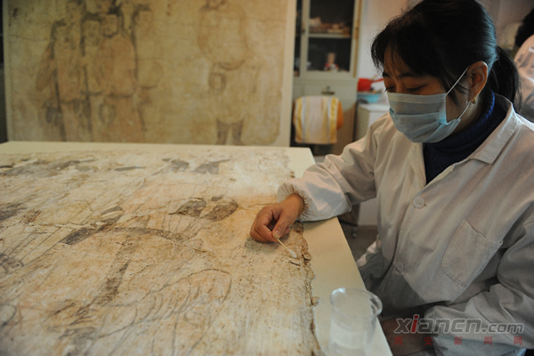 进入古代壁画保护实验室,就被树立的一幅隋壁画吸引了,色彩依旧,表情生动。壁画说到底,就是一层脆弱的墙皮。怎么保护修复的呢?省考古研究院文保部副主任王啸啸进行了揭秘。