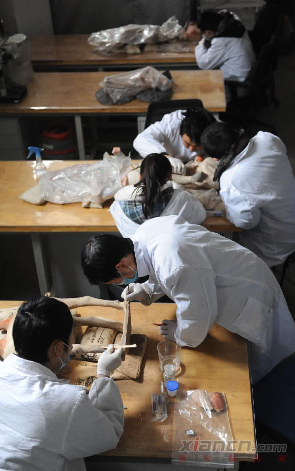 省考古研究院助理研究员邵安定对“天鹅”修复过程进行了揭秘。提取时如果状态差,就用医用绷带封住先提取出来。经过表面清理,清除土迹和锈迹。再用高分子材料将裂痕粘接,然后进行整体加固,根据情况泡在特定溶液中,或者是刷几遍延缓锈蚀的溶液。最后,再对残破部分进行拼接、支撑、修理。完全修复好一只至少需要一个人用半年的时间。在这间实验室中,修复周期最长的算是唐代一位公主墓里出土的一顶珠光宝气的冠饰。足足用了两年多的时间,因为零部件太多。已经散落的无数珠子和大小佩饰,搞清楚它们之间的关系和排序,就花费了大量时间。