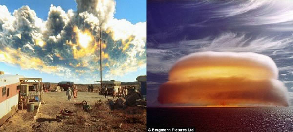 图4中的左侧是《独立日》影片中外星人飞船来访地球的情景,外星人用厚厚的云层进行掩护。而到了1996年,诸如《独立日》这类的科幻电影充分展示了宇宙飞船“腾云驾雾”进行隐蔽的情景。在图4的右侧,是法国在太平洋进行核试验的情景。