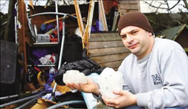 上图为英国《太阳报》报道的,英国32岁男子罗伊德·加特日前正在家中和家人吃晚餐,一个散发着异味的巨大球形物体呼啸着从天而降,如炮弹一般落入他家的花园中,瞬间将花园变成了一片废墟。加特本以为这个“不明飞行物”是外星陨石之类的东西,但经他仔细检查后发现,那竟是一块从飞机厕所泄漏出的尿液结冰后形成的“尿冰球”。
