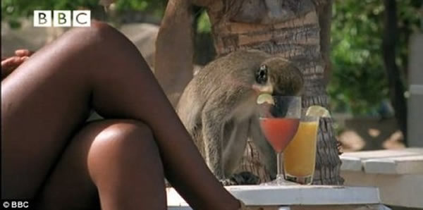 加勒比海圣基茨岛(Caribbean Island of St Kitts)上的猴子有爱喝酒的嗜好。这些喜爱饮酒的猴子经常“洗劫”岛上的酒吧,以满足他们对酒的需求。有游客还拍下了猴子用手捧着酒杯喝酒的有趣视频。