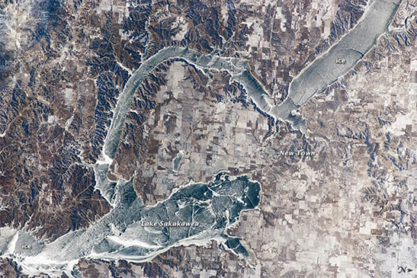 严酷的冬季经常光顾美国北达科他州。这张照片是国际空间站上的宇航员于2012年1月19日拍下的。1月29日,冰雪覆盖了萨卡卡威湖西北部。据北达科他州新镇(New Town)附近的一个气象站报告,当地时间10时36分(这幅照片拍摄前6分钟),气温下降至零下24摄氏度(华氏零下11度),冷风温度约为零下32度。除了湖面上的灰色冰盖,白雪也覆盖了北部和东北部的农业区。
