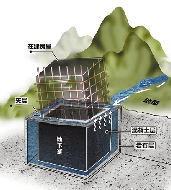 经过初步勘察,地质专家盛祝生认为,刘小荣华家的地下室就相当于一个密封性很好的“水泥箱”,而外面全部都是岩石就形成了一个巨型的“浴缸”。而浴缸与“水泥箱”之间是大约50厘米宽的夹层,基本都是泥水浆。
