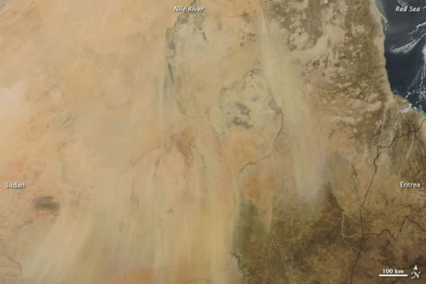 尼罗河蜿蜒向北流经苏丹,在苏丹境内向东绕了一个大圈,然后折回西边。上午,尼罗河的大部分仍然可以辨认,但到了下午,沙尘暴遮盖了尼罗河的大部分流域。红海上空的沙尘暴在下午也变厚,尽管西部的天空变得清晰了一点。