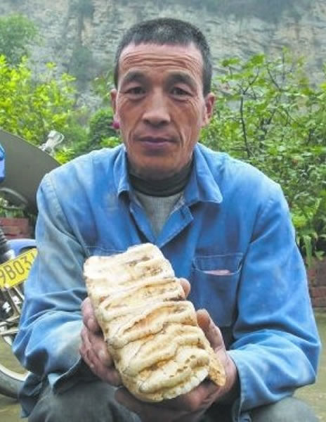 丁庭虎是幺灏村天山坡采石场的工人,他在山头钻击炮眼时,意外发现几段个头较大的骨头化石,他并不知道其价值,把它当成稀奇玩意儿拿回家哄孙子。