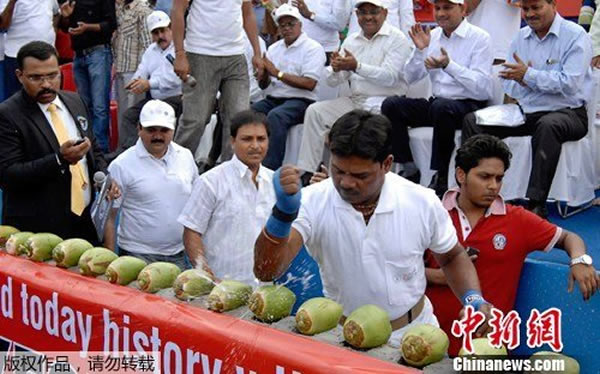 印度男子打破1分钟内肘击85个椰子的吉尼斯世界纪录 来源: 神秘的地球 时间:2012年3月02日 15:49 印度男子打破1分钟内肘击85个椰子的吉尼斯世界纪录 当地时间2012年2月29日,印度布巴内斯瓦尔,名为Keshab Swain的男子正在用手肘击碎椰子,试图创造新的吉尼斯世界纪录。据媒体报道,Swain打破了一分钟内肘击85个椰子的世界纪录。 中国新闻网 上一篇 下一篇 TAG: 吉尼斯 世界纪录