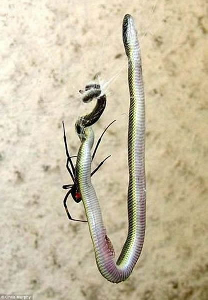 这条蛇离开地面,悬在蜘蛛网上。这只蜘蛛移向蛇,以便将其杀死。