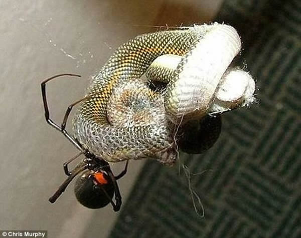 这只14厘米长的蜘蛛展开一项轻松工作,将蛇蜷成一团,以便更好地进食。