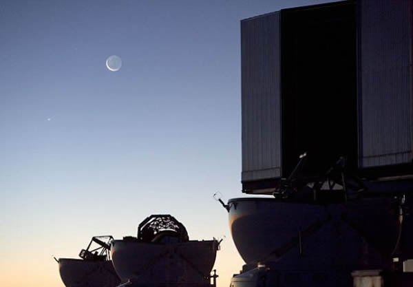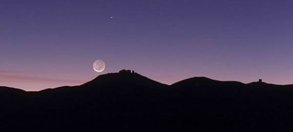 旁晚时分智利欧洲南方天文台帕瑞纳天文台甚大望远镜上方的月球画面。我们从图中可以看到被地球反射的微弱光线照亮的整个月球的圆盘,这种现象名叫地球反照