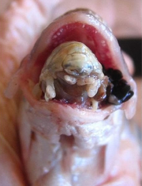 调查结果显示意大利一处水域接近一半的鱼类都感染这种可怕寄生虫,它们游动进入幼鱼的鳃中,然后逐渐吞食它的舌尖,并替代这一位置,以鱼类的血液为食。