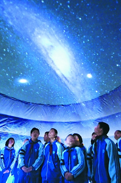 海淀温泉二中的同学们在新建的天文教室里仰望“星空”。