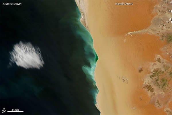 2012年2月29日,美国宇航局泰若卫星(Terra)上的中分辨率成像光谱仪(MODIS)拍下了这张自然色照片。淡绿色的海水沿着纳米布沙漠(Namib Desert)蜿蜒向前,绵延约150公里