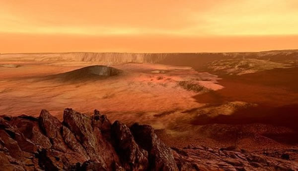 火星上的海拉斯盆地被认为是小行星猛烈撞击所留下的,其中沉积岩的碎片环形分布于陨石坑周围,厚度可达一英里。图2为小行星出现在水手峡谷(Valles Marineris)上方的想象图,正是1500英里宽的小行星撞击造成火星磁场的消失。据火星探测器报告显示,该盆地形成于41至42亿年前,当时正处于火星磁场动乱的年代。