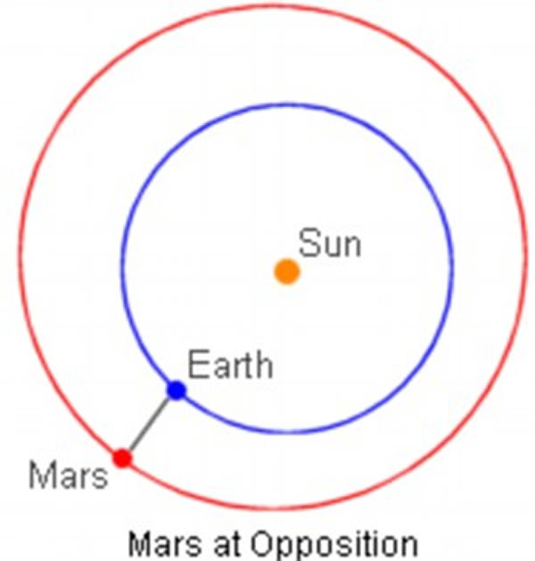 天文学家描绘火星冲日,火星和太阳位于地球的两边