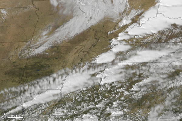 美国宇航局地球观测站今日公布了一张卫星照片,展示了近日出现在美国的龙卷风景象。