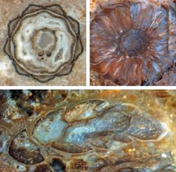圣奥斯丁沉积中的化石是立体保存的(左:木贼茎横断面;右:松塔横断面;下:一束针叶的纵面观)