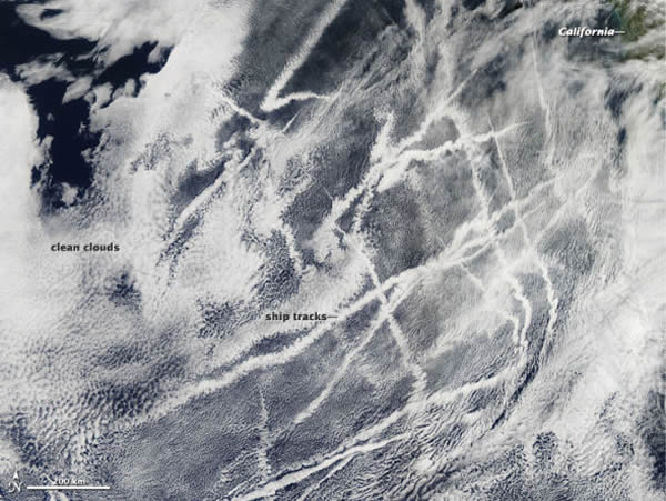 船舶所产生的污染物颗粒中有一些(特别是硫酸盐)是可溶性的,它们可以作为云凝结核。在污染物颗粒周围形成的云团比清洁的云团具有更多、更小的液滴。因此,光照射在船舶轨道上之后向许多不同的方向散射,使船舶轨道看起来比其他类型的海洋云层更明亮。(在此图像中,船舶轨道并不显得特别明亮,因为周围的云团也相当明亮。但是,在2009年3月和2010年7月拍下的照片中,船舶轨道特别明亮。)