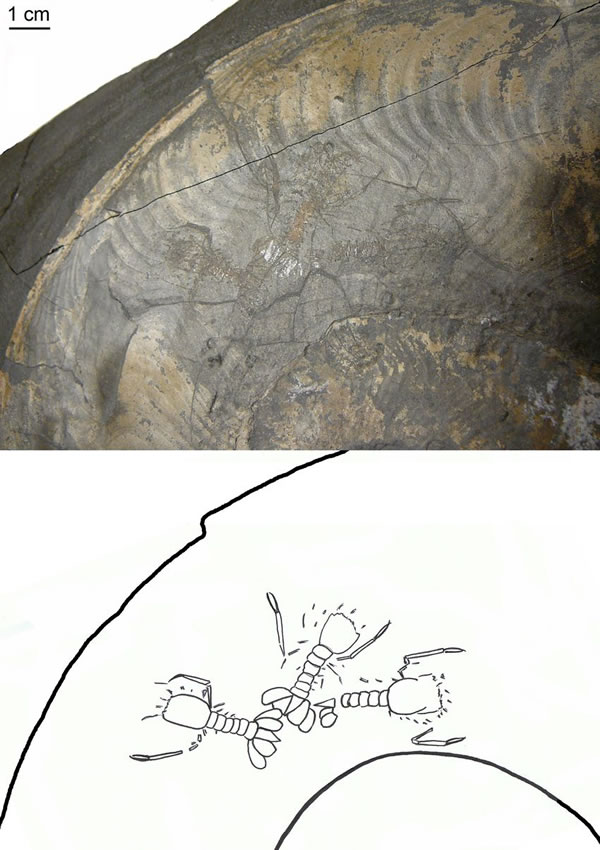 Posidonia页岩优越的保存条件使得研究者能利用低角度光线透过菊石半透明的、薄的蜕壳(periostracum)观察到其内的龙虾。菊石壳体内的龙虾呈尾部互相对着的状态,并组成一个圈形,Klompmaker说,为何这些龙虾会呈现这样的保存状态目前仍不清楚,它们可能曾在这里暂时藏身以躲避天敌,或是一直栖居于此。