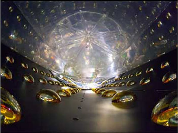 这是在没有灌装闪烁液之前的圆柱形反中微子探测器内部照片。该探测器用于捕捉反中微子产生的微弱闪光。高灵敏的光电倍增管排列在探测器的壁上。