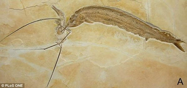 科学家发现数块化石,上面显示一条身披甲壳的古代鱼捕捉到一个猎物。这块惊人的化石在德国南部巴伐利亚州出土,约有1.2亿年历史,显示长尾翼龙想展翅飞走,却未能逃出食肉剑鼻鱼的魔掌。