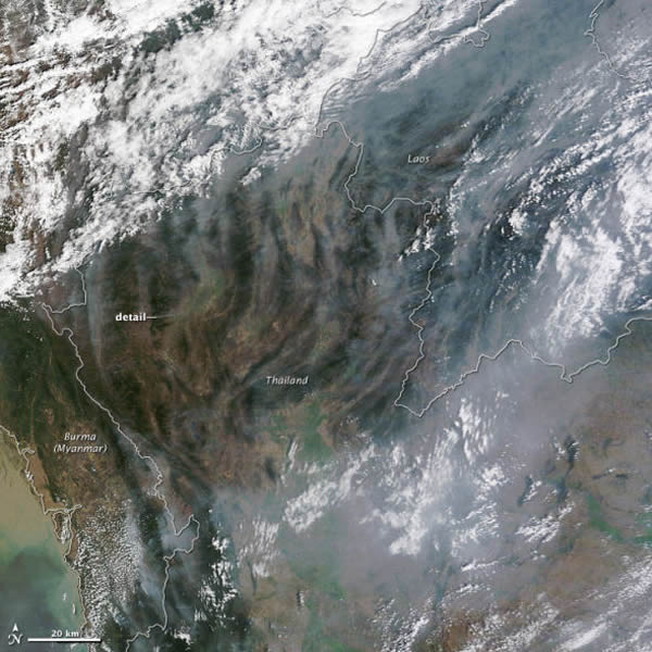 2012年3月,大范围的农业区和森林火灾在东南亚上空制造了厚厚的烟雾和阴霾,笼罩了泰国北部、老挝和缅甸部分地区。火灾区上空的悬浮物微粒浓度达到危险水平,并导致泰国南邦机场航班延误,泰国领导人已经呼吁采取行动。