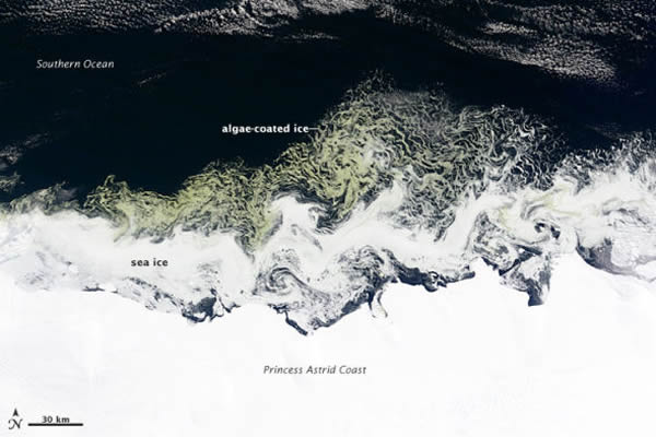美国宇航局地球观测站今日公布了一张卫星照片,展示了东南极洲阿斯特里德公主海岸(Princess Astrid Coast)附近的藻花景象。