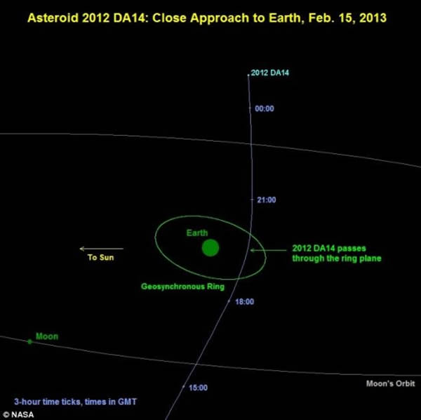小行星2012 DA14的运行周期约366天,预计它将于明年2月15日抵达最接近地球的位置,届时它的轨道高度甚至将低于一些人造卫星